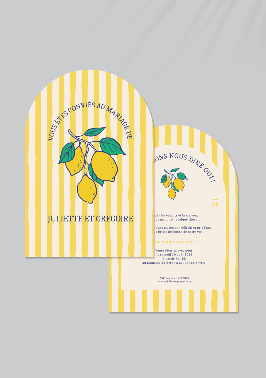 - Carton réponse (en option) : 14.8 x 10.5 cm en papier Olin mat 300gr blanc naturel (lisse) ou Rives Tradition 320gr