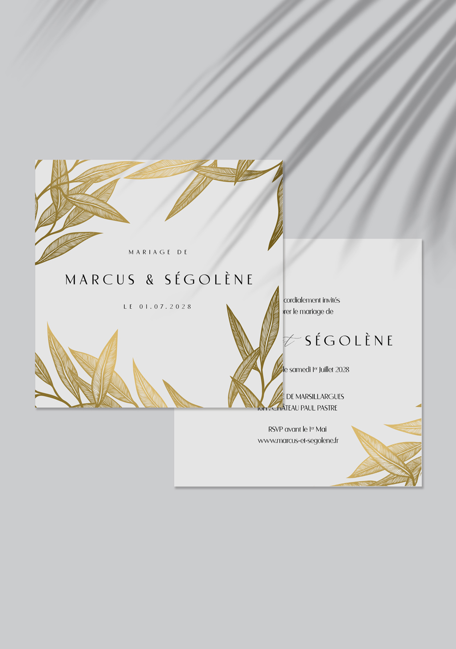 - Carton réponse (en option) : 14.8 x 10.5 cm en papier Olin mat 300gr blanc naturel (lisse) ou Rives Tradition 320gr