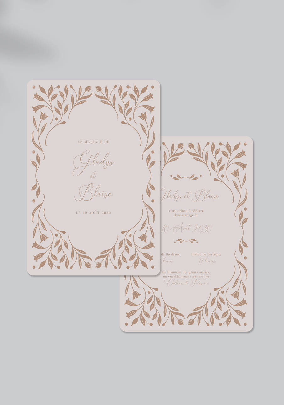 - Carton réponse (en option) : 14.8 x 10.5 cm en papier Olin mat 300gr blanc naturel (lisse) ou Rives Tradition 320gr