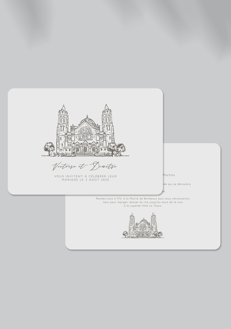 - Carton réponse (en option) : 14.8 x 10.5 cm en papier Olin mat 300gr blanc naturel (lisse) ou Rives Tradition 320gr