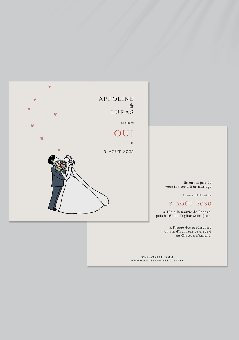 - Carton réponse (en option) : 14.8 x 10.5 cm en papier Olin mat 300gr blanc naturel (lisse) ou Rives Tradition 320gr
