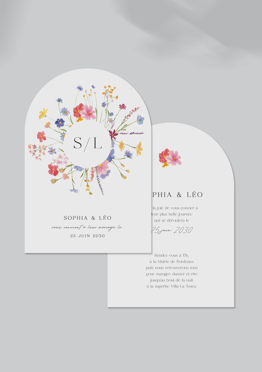 - Carton réponse (en option) : 14.8 x 10.5 cm en papier Olin mat 300gr blanc naturel (lisse) ou Rives Tradition 320gr