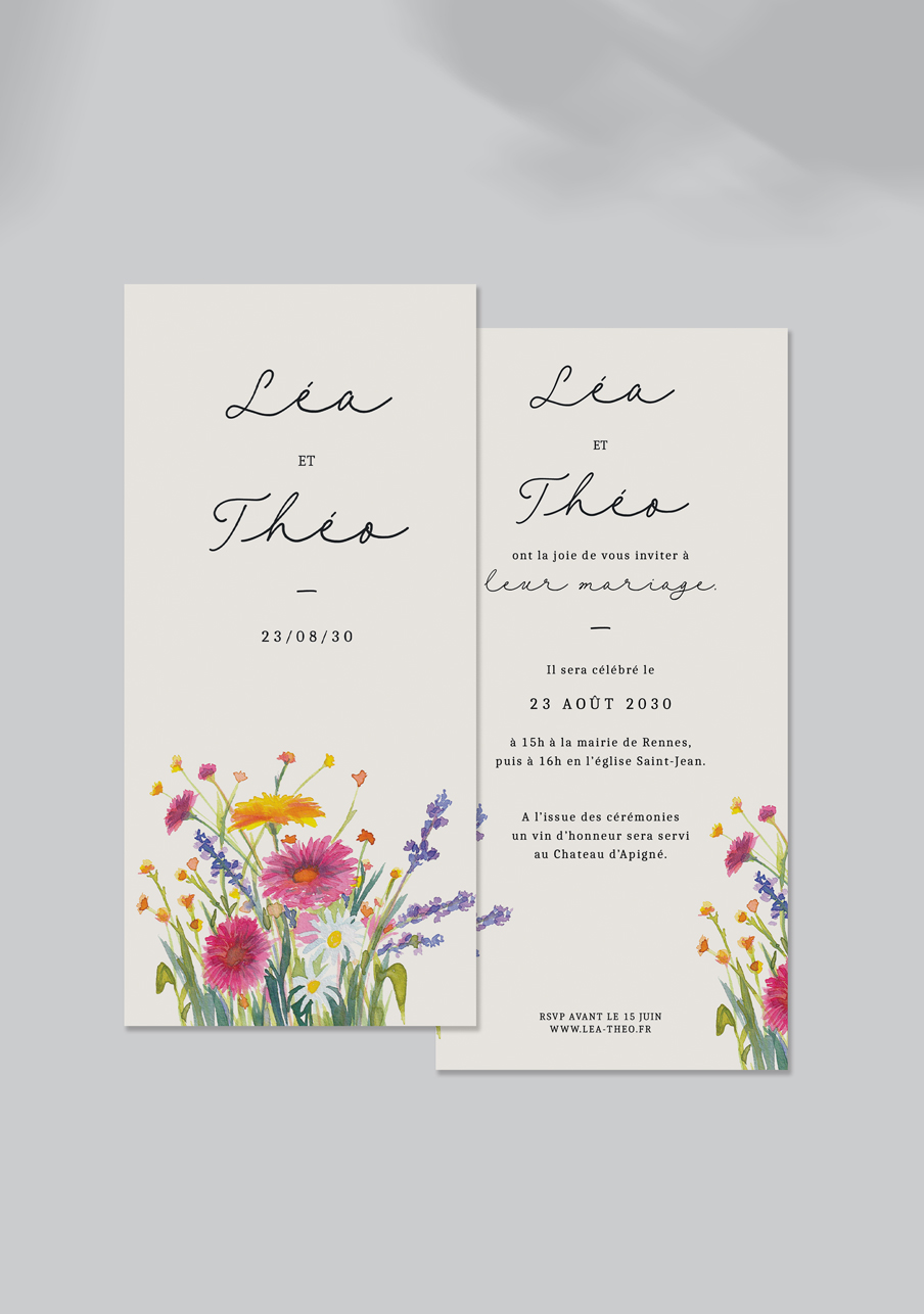 - Carton réponse (en option) : 14.8 x 10.5 cm en papier Olin mat 300gr blanc naturel (lisse) ou Rives Tradition 320gr