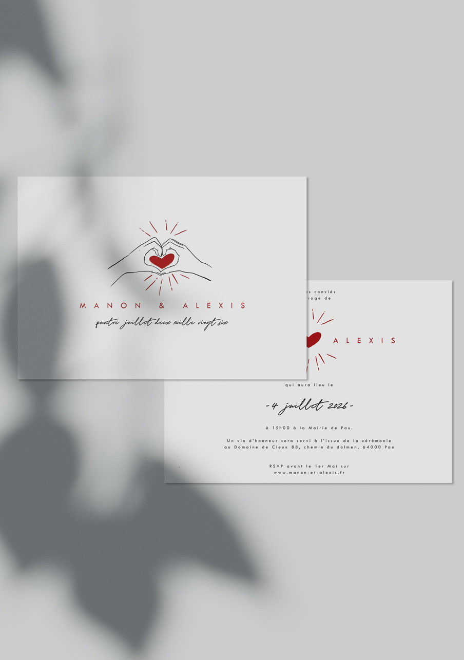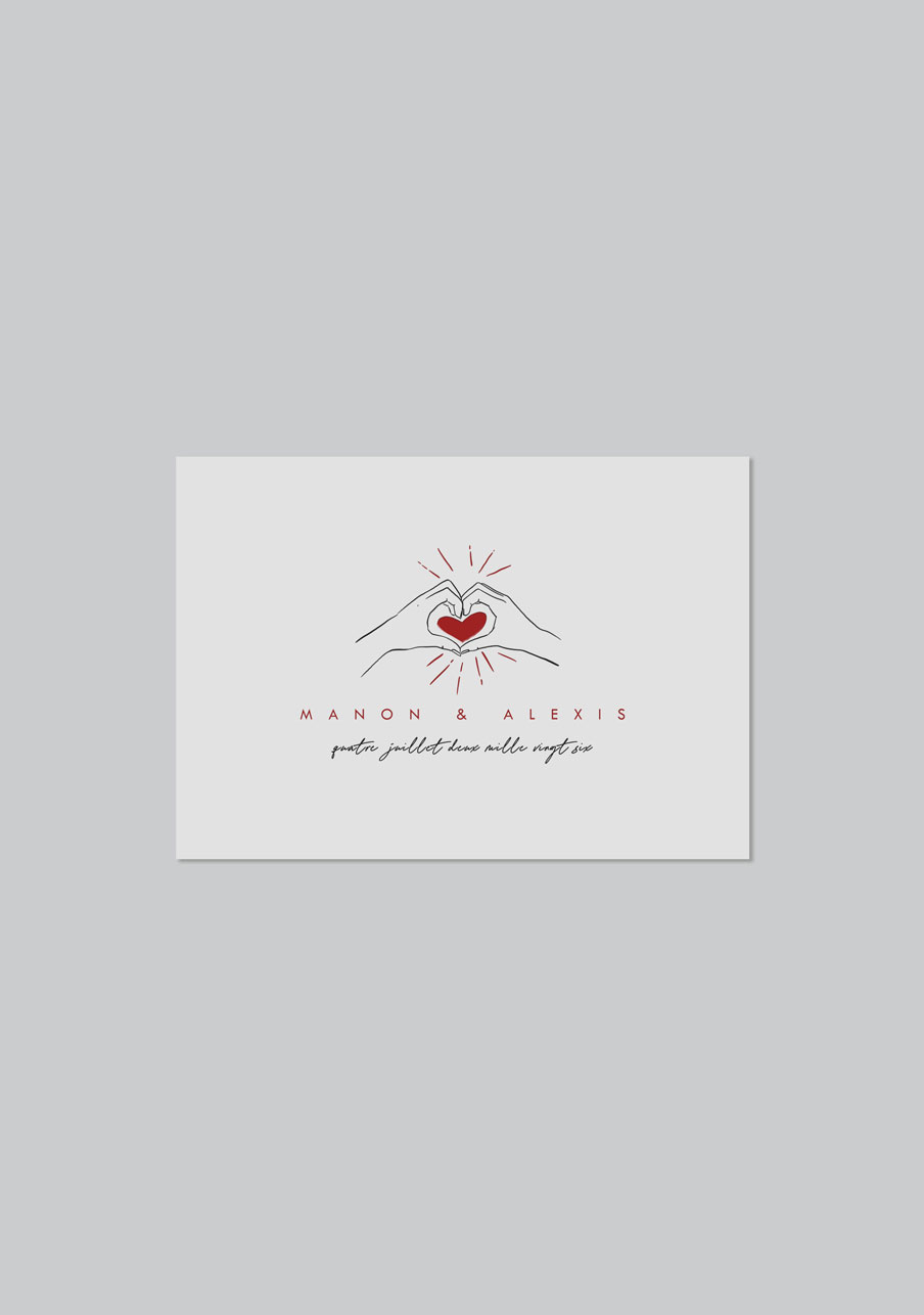 - Carton réponse (en option) : 14.8 x 10.5 cm en papier Olin mat 300gr blanc naturel (lisse) ou Rives Tradition 320gr