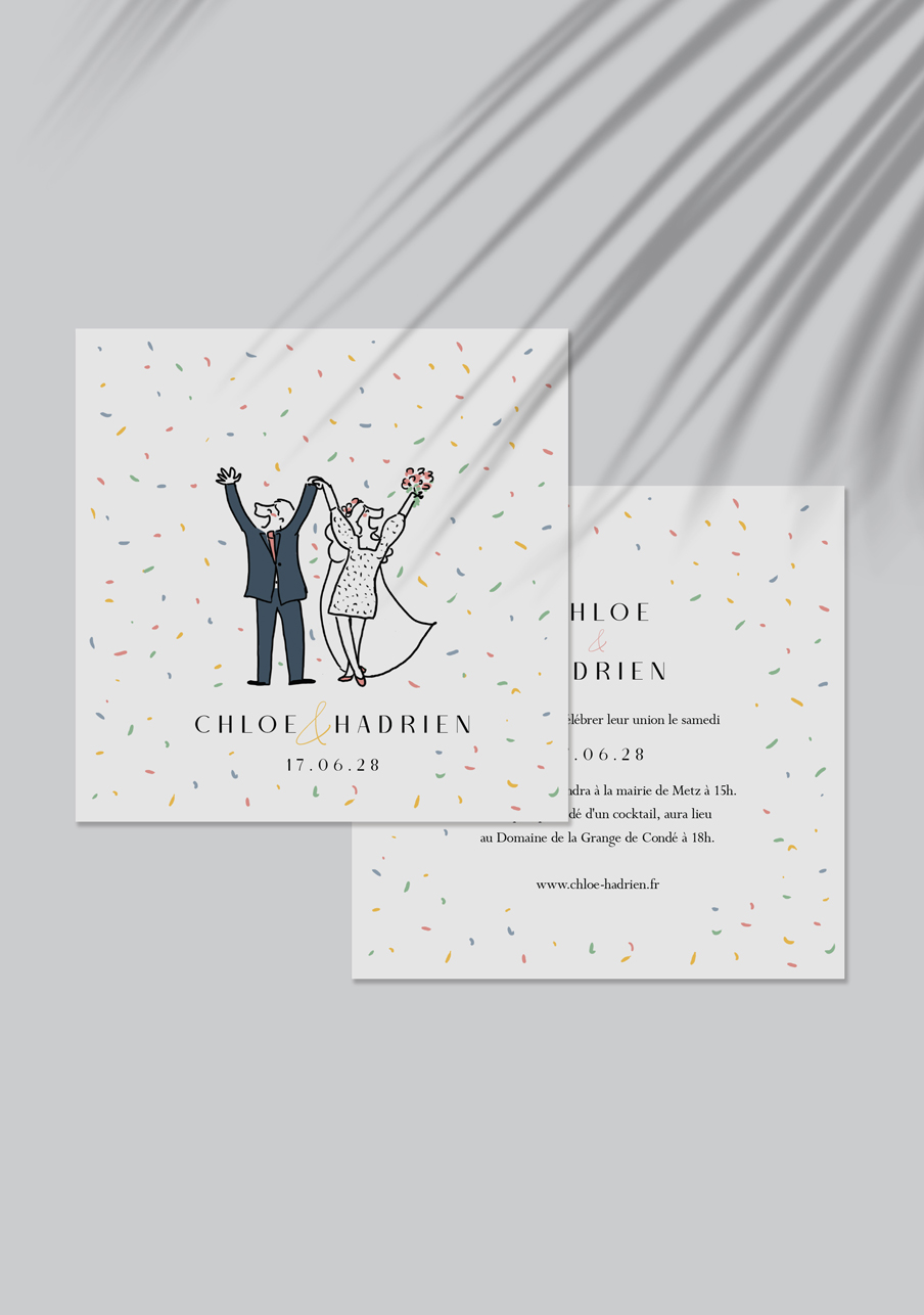 - Carton réponse (en option) : 14.8 x 10.5 cm en papier Olin mat 300gr blanc naturel (lisse) ou Rives Tradition 320gr