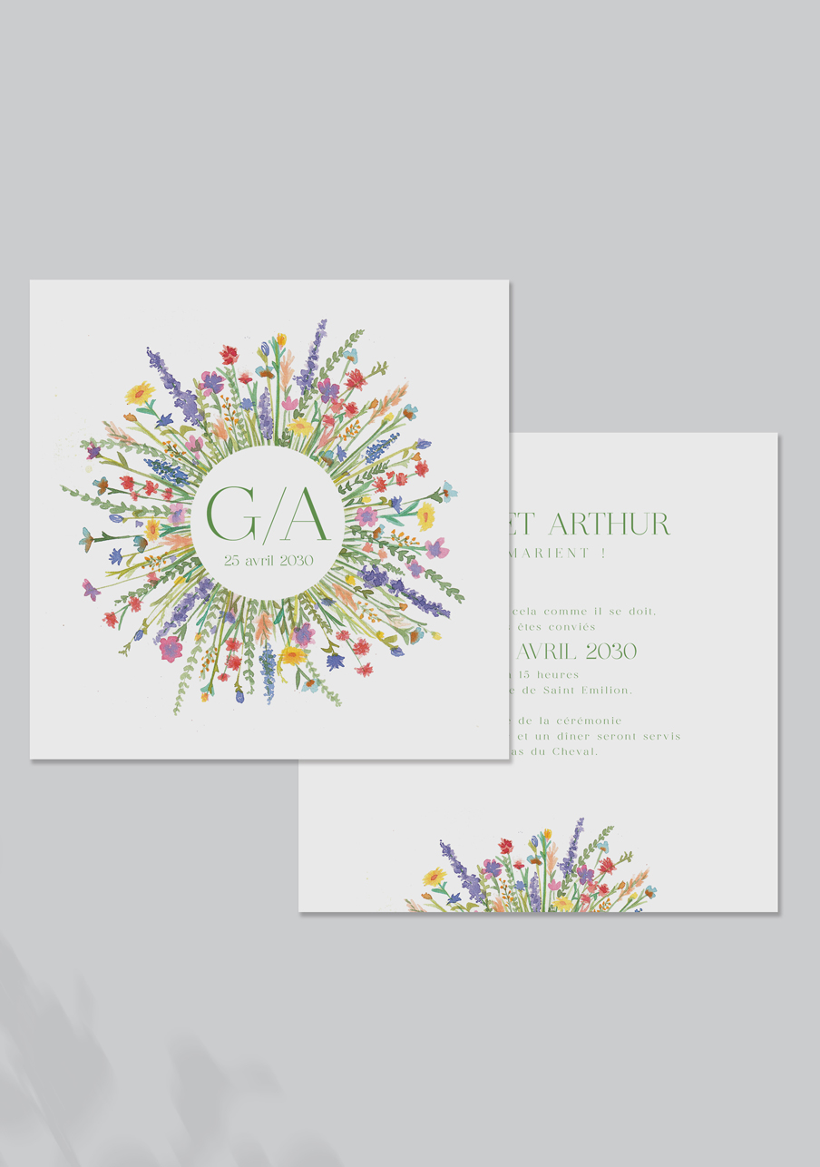 - Carton réponse (en option) : 14.8 x 10.5 cm en papier Olin mat 300gr blanc naturel (lisse) ou Rives Tradition 320gr