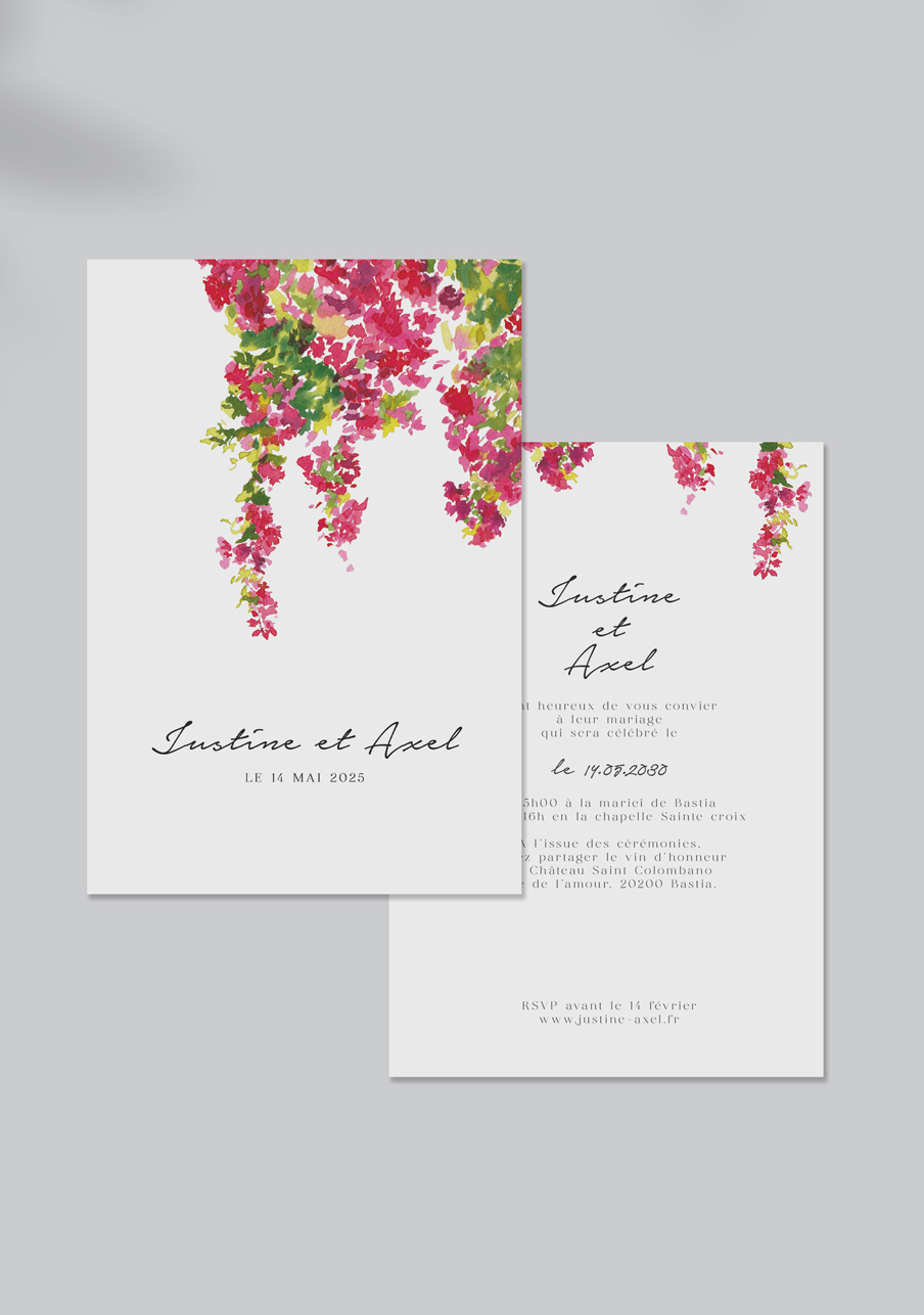- Carton réponse (en option) : 14.8 x 10.5 cm en papier Olin mat 300gr blanc naturel (lisse) ou Rives Tradition 320gr