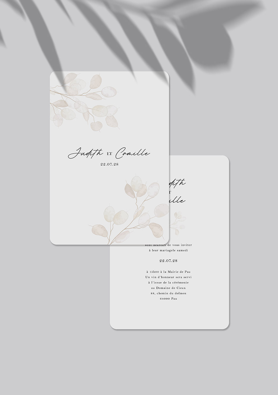 - Carton réponse (en option) : 14.8 x 10.5 cm en papier Olin mat 300gr blanc naturel (lisse) ou Rives Tradition 320gr