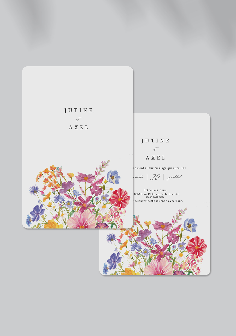 - Carton réponse (en option) : 14.8 x 10.5 cm en papier Olin mat 300gr blanc naturel (lisse) ou Rives Tradition 320gr