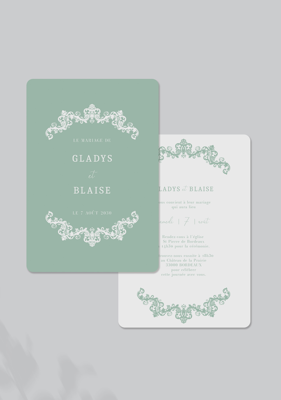 - Carton réponse (en option) : 14.8 x 10.5 cm en papier Olin mat 300gr blanc naturel (lisse) ou Rives Tradition 320gr