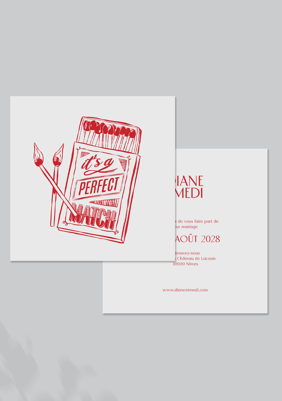 - Carton réponse (en option) : 14.8 x 10.5 cm en papier Olin mat 300gr blanc naturel (lisse) ou Rives Tradition 320gr