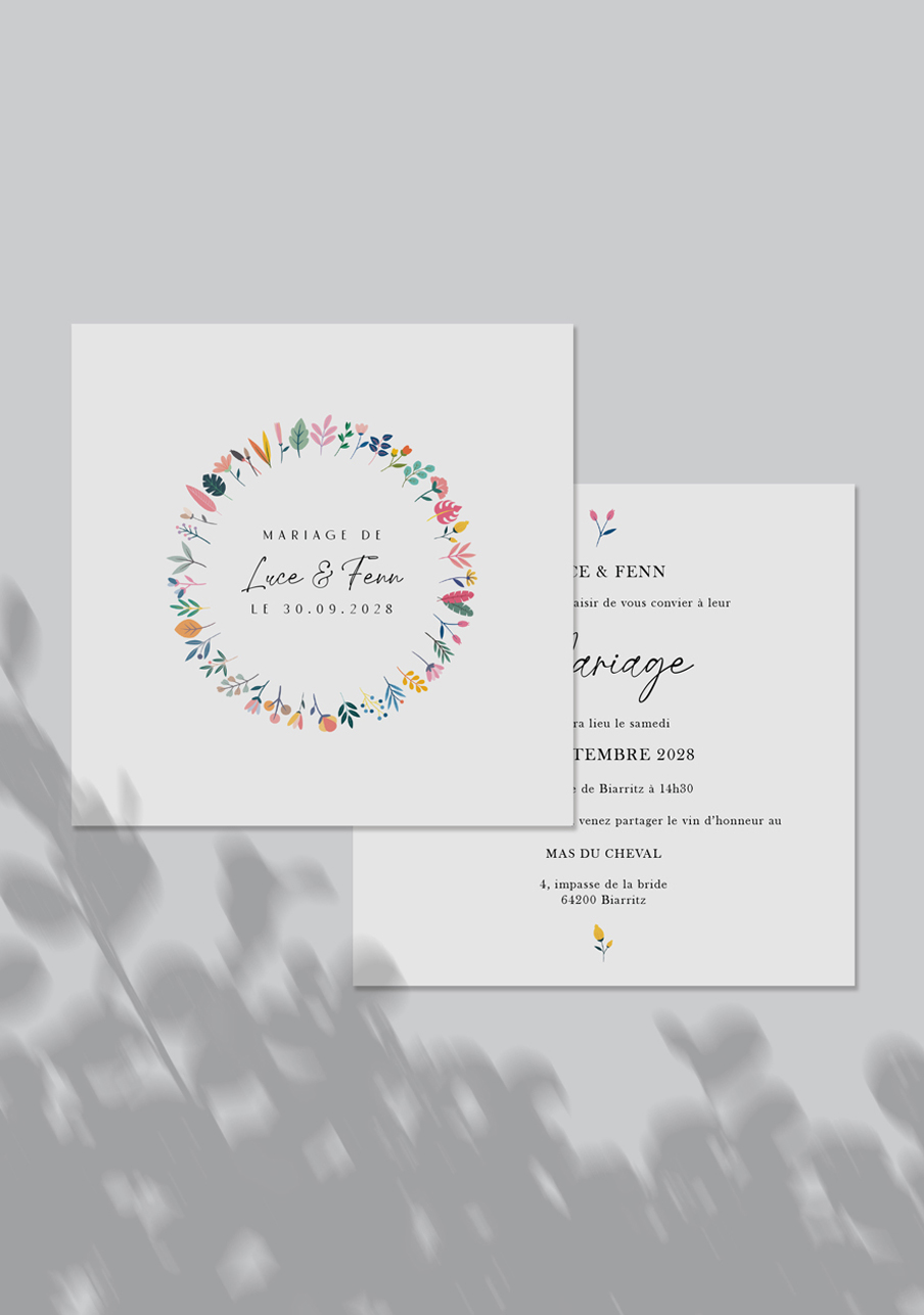 - Carton réponse (en option) : 14.8 x 10.5 cm en papier Olin mat 300gr blanc naturel (lisse) ou Rives Tradition 320gr