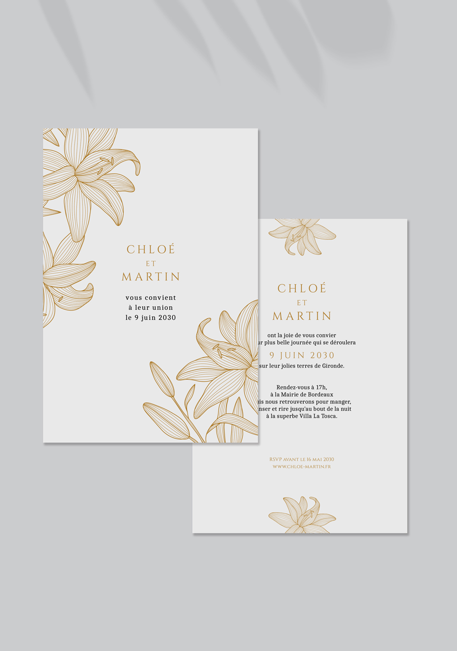 - Carton réponse (en option) : 14.8 x 10.5 cm en papier Olin mat 300gr blanc naturel (lisse) ou Rives Tradition 320gr