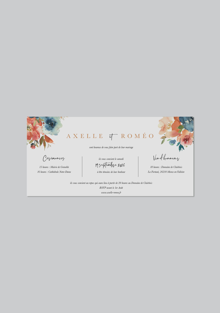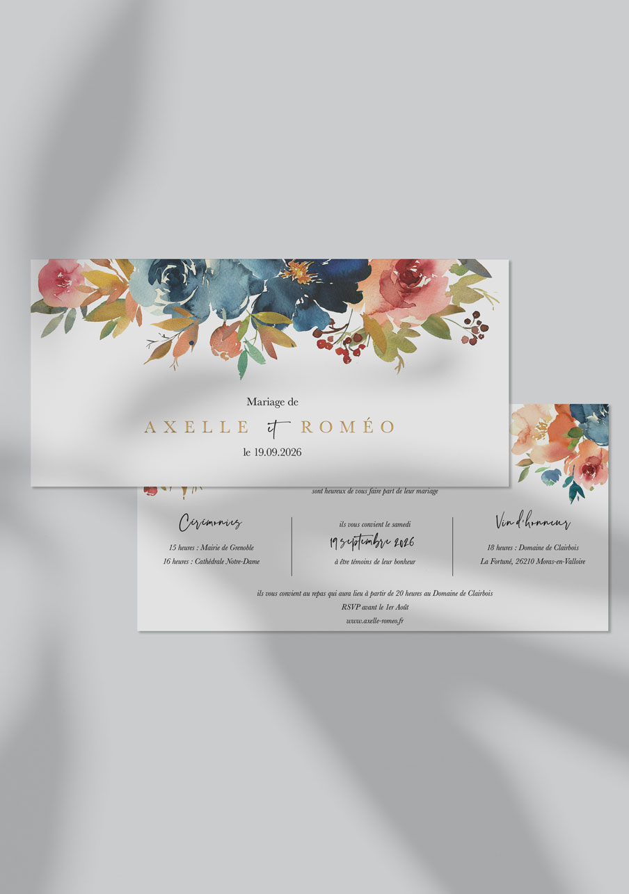 - Carton réponse (en option) : 14.8 x 10.5 cm en papier Olin mat 300gr blanc naturel (lisse) ou Rives Tradition 320gr