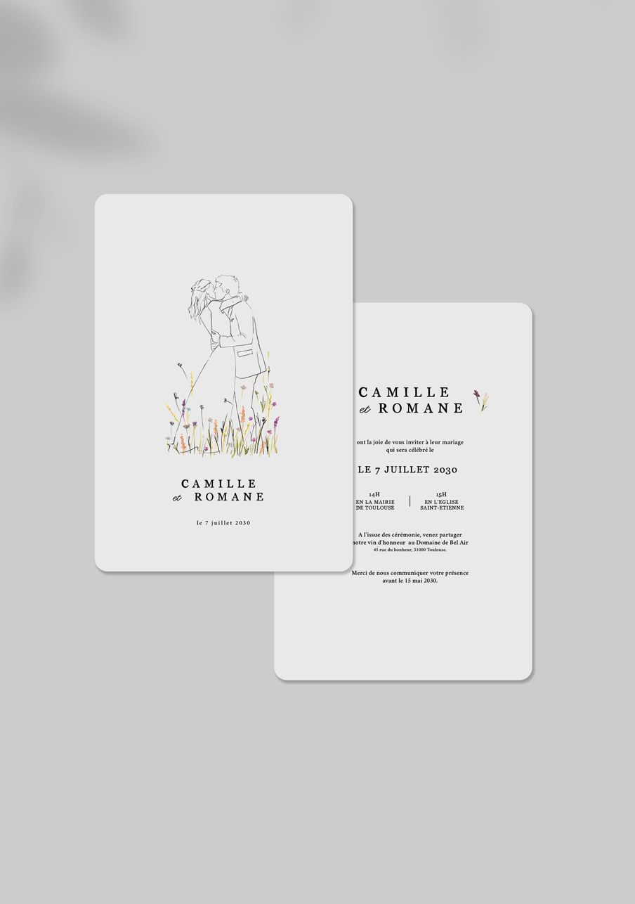 - Carton réponse (en option) : 14.8 x 10.5 cm en papier Olin mat 300gr blanc naturel (lisse) ou Rives Tradition 320gr