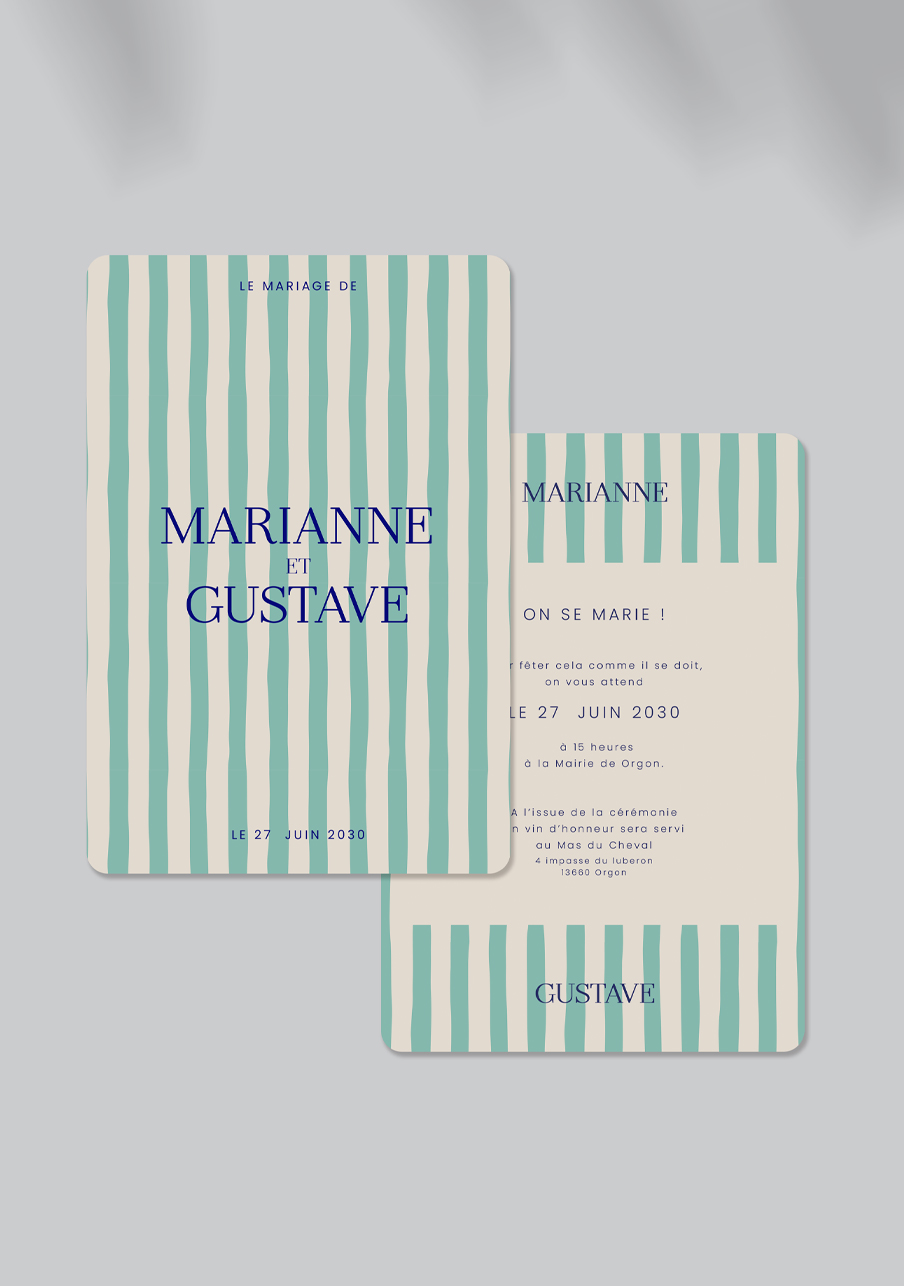 - Carton réponse (en option) : 14.8 x 10.5 cm en papier Olin mat 300gr blanc naturel (lisse) ou Rives Tradition 320gr