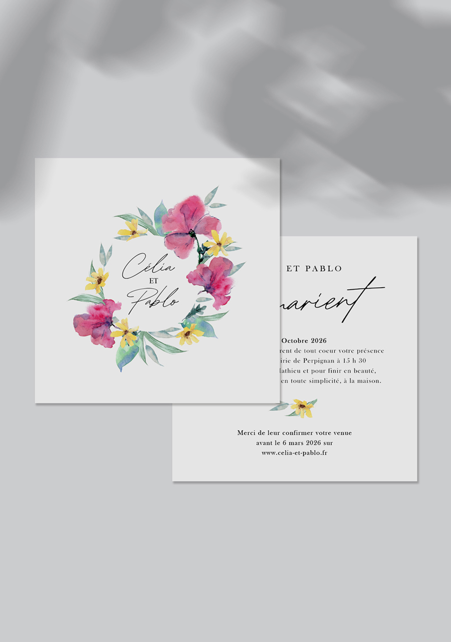 - Carton réponse (en option) : 14.8 x 10.5 cm en papier Olin mat 300gr blanc naturel (lisse) ou Rives Tradition 320gr