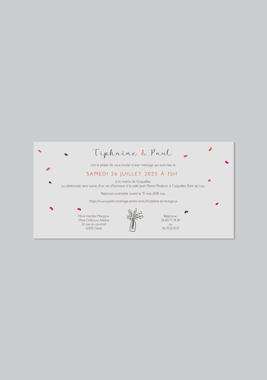 - Carton réponse (en option) : 14.8 x 10.5 cm en papier Olin mat 300gr blanc naturel (lisse) ou Rives Tradition 320gr