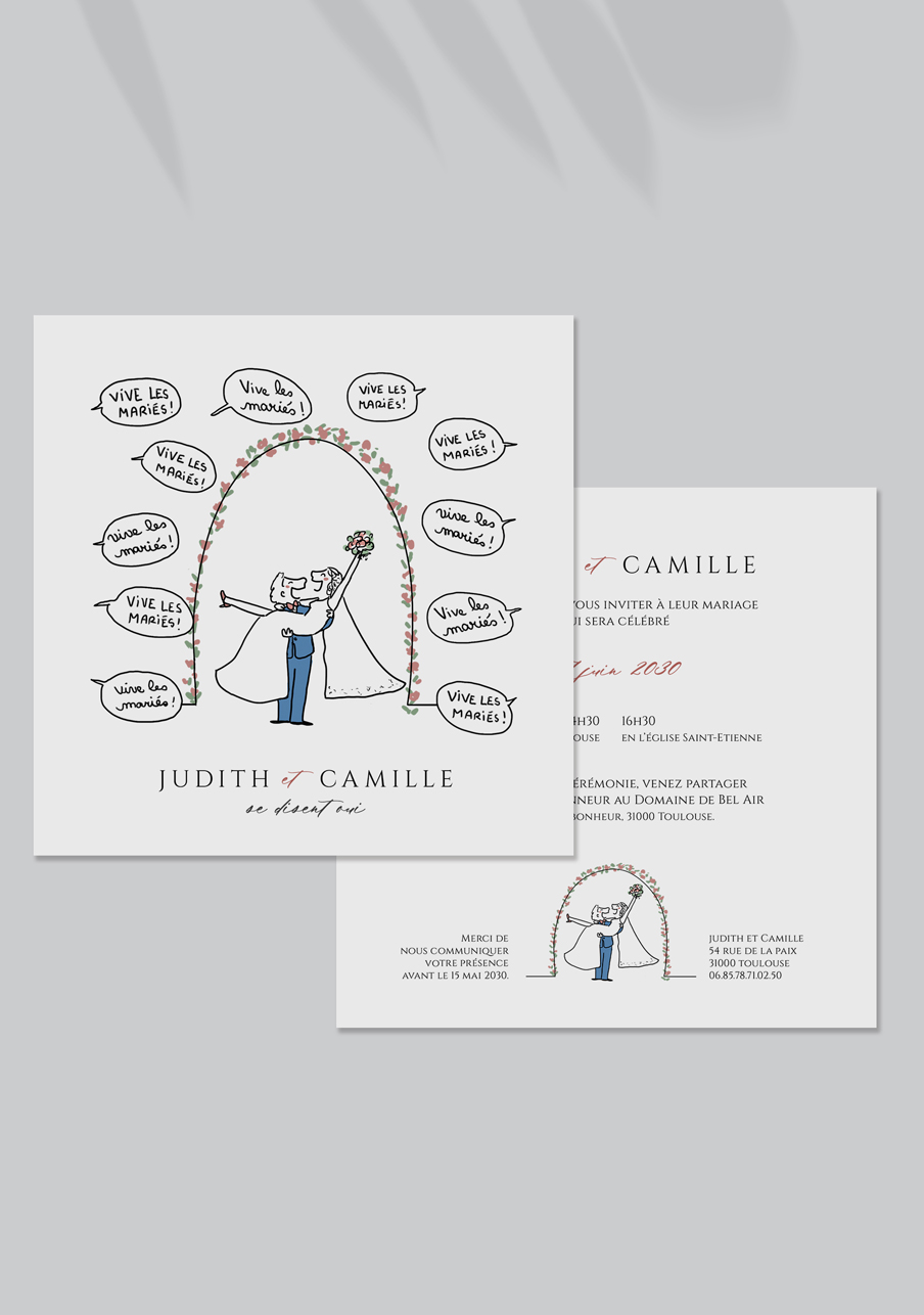 - Carton réponse (en option) : 14.8 x 10.5 cm en papier Olin mat 300gr blanc naturel (lisse) ou Rives Tradition 320gr