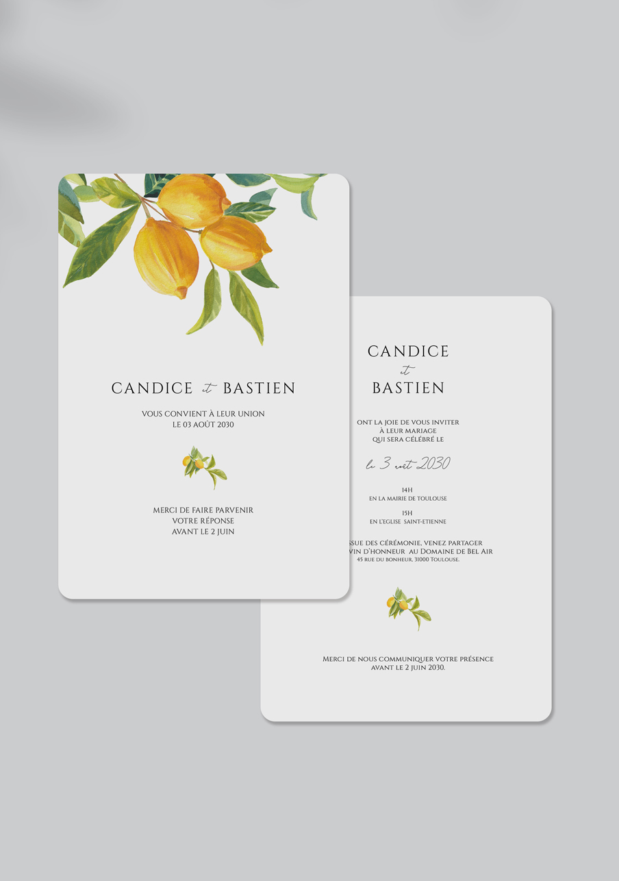 - Carton réponse (en option) : 14.8 x 10.5 cm en papier Olin mat 300gr blanc naturel (lisse) ou Rives Tradition 320gr
