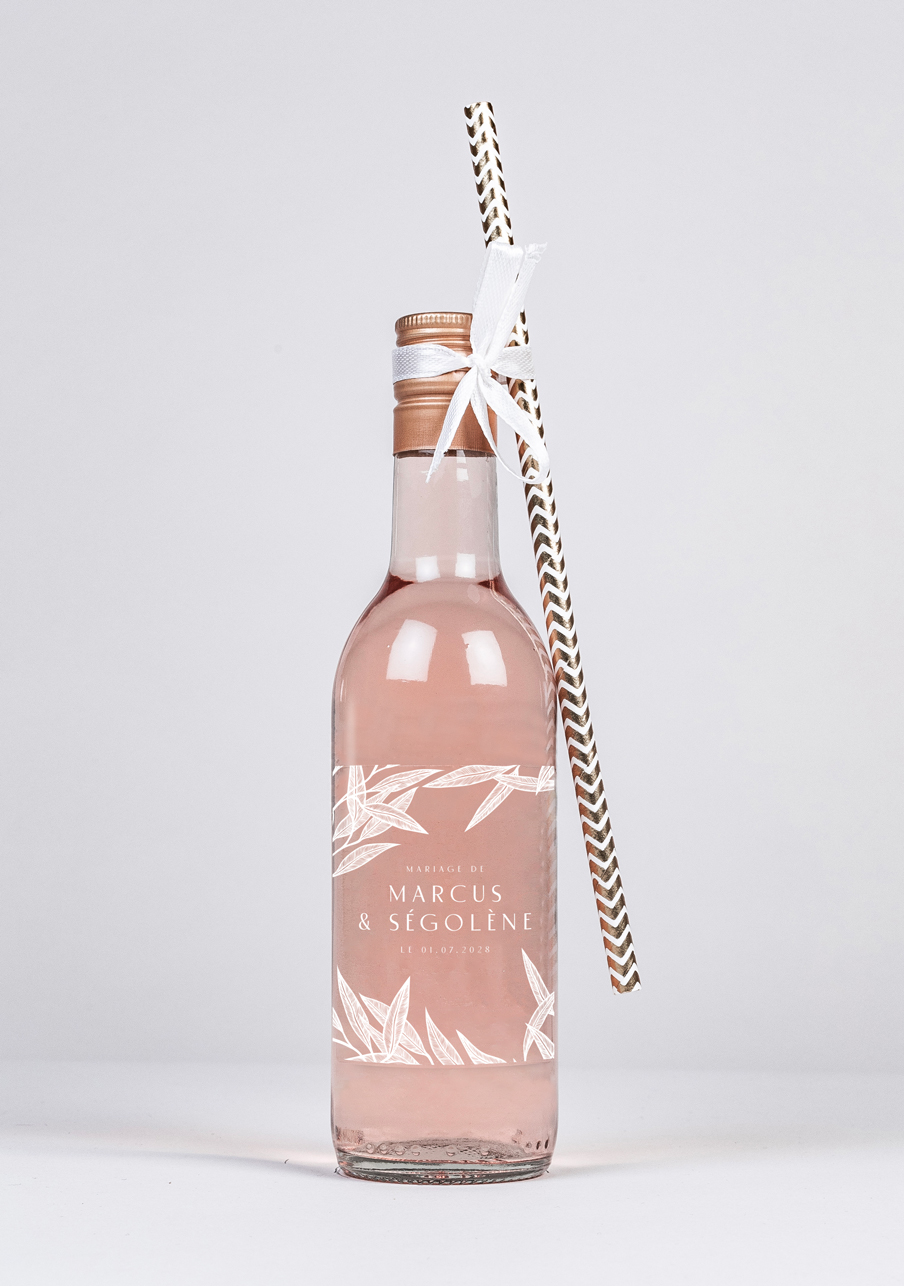 - Conditionnement : Carton contenant 24 bouteilles accompagnées de 24 pailles blanches ornées de chevrons dorés et d'un ruban effet satin de couleur crème et d'une longueur de 25 m