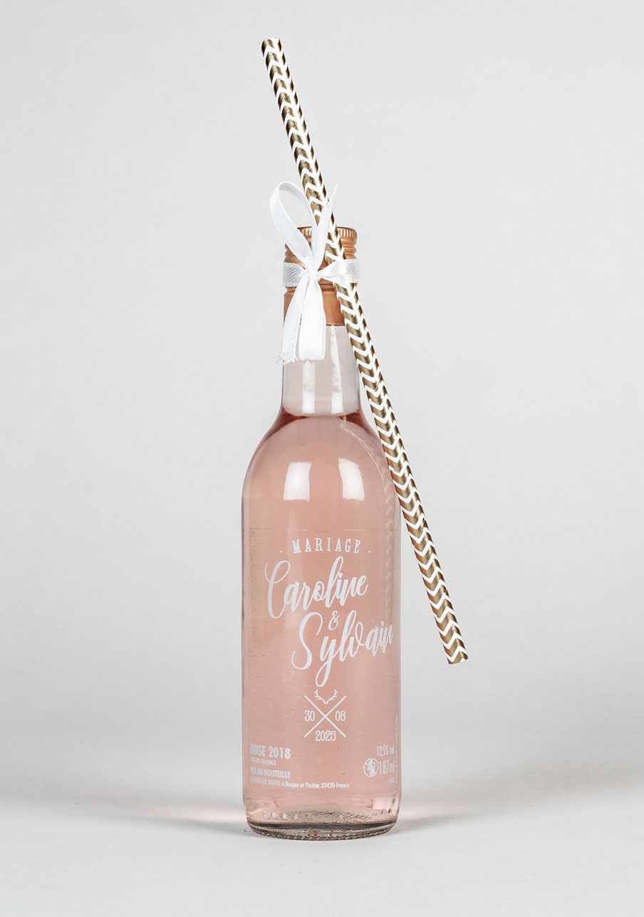 - Conditionnement : Carton contenant 24 bouteilles accompagnées de 24 pailles blanches ornées de chevrons dorés et d'un ruban effet satin de couleur crème et d'une longueur de 25 m