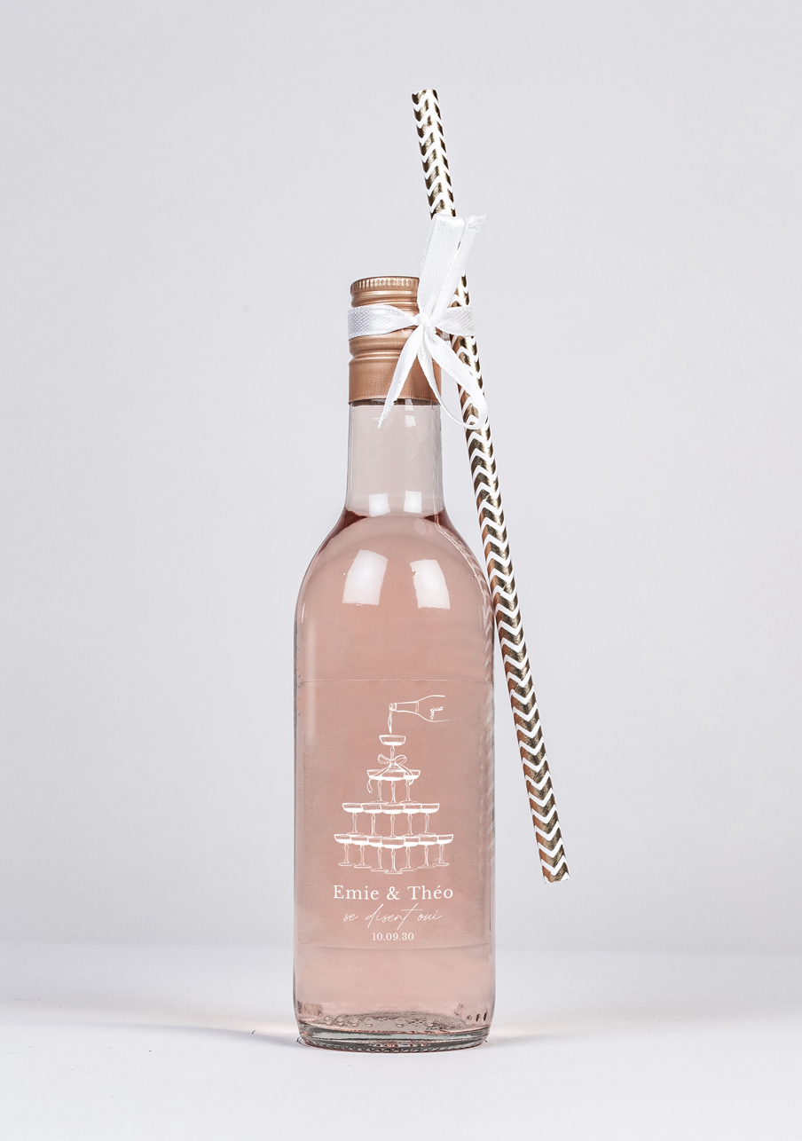 - Conditionnement : Carton contenant 24 bouteilles accompagnées de 24 pailles blanches ornées de chevrons dorés et d'un ruban effet satin de couleur crème et d'une longueur de 25 m