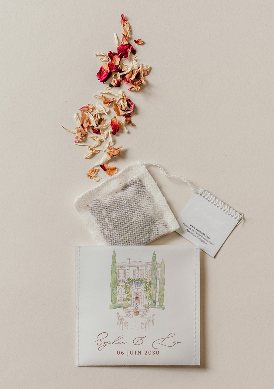 - Sachet biologiques et compostables : surenveloppe en papier texturé premium sourcé en UE et mousseline en coton biologique certifié Ecocert.