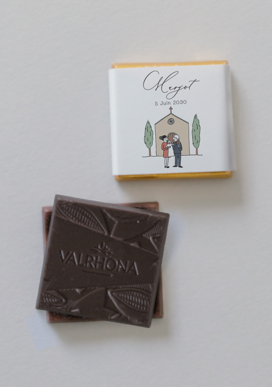 - De délicieux carrés de chocolats de la marque Valrhona, à personnaliser avec le visuel de votre choix.