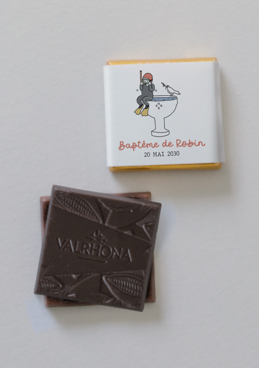 - De délicieux carrés de chocolats de la marque Valrhona, à personnaliser avec le visuel de votre choix.