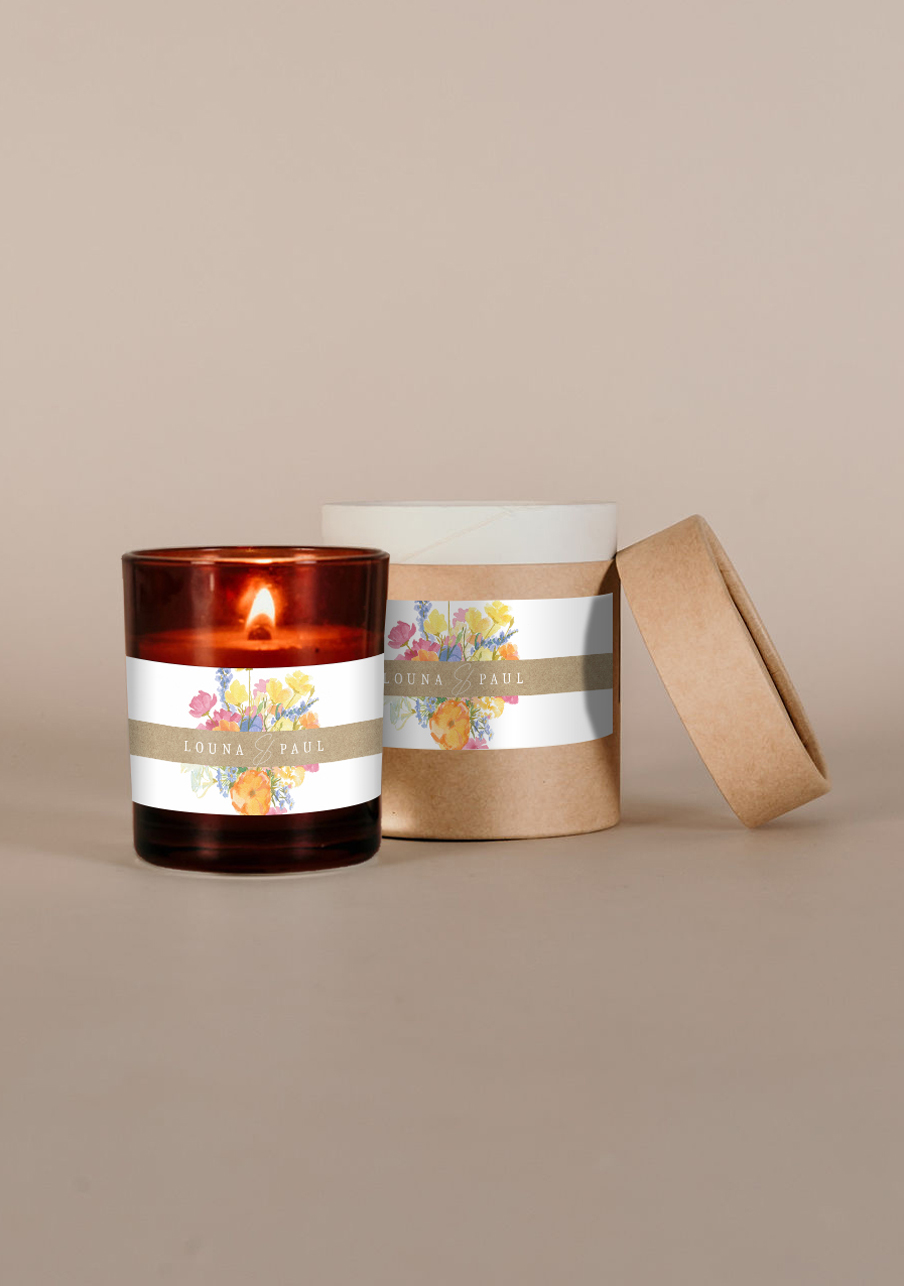 - Optez pour un cadeau élégant avec ces petites bougies en verre ambrées présentées dans leur jolie boîte en kraft et personnalisées avec leurs étiquettes.