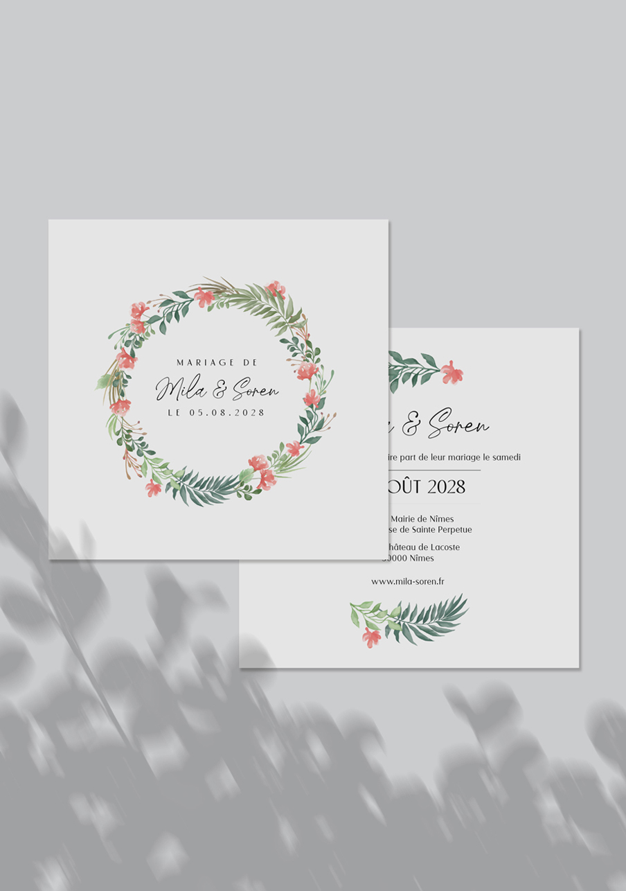 - Carton réponse (en option) : 14.8 x 10.5 cm en papier Olin mat 300gr blanc naturel (lisse) ou Rives Tradition 320gr