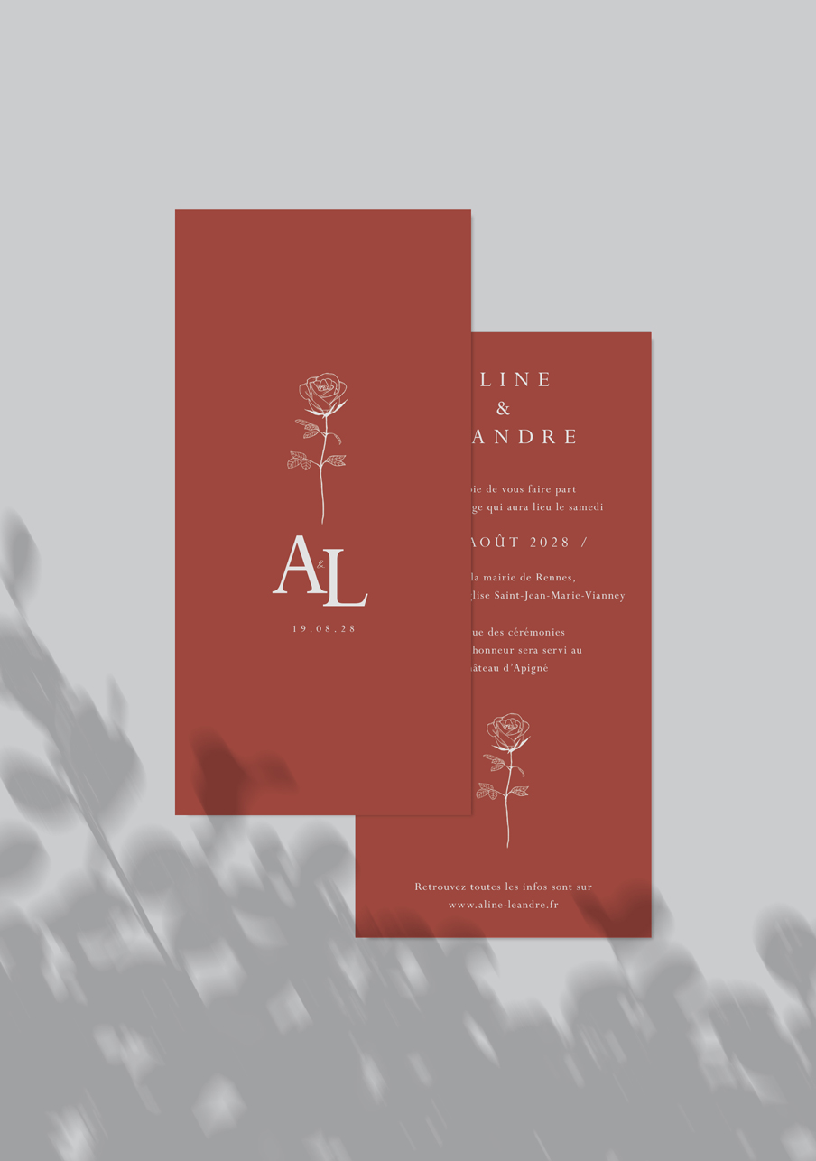 - Carton réponse (en option) : 14.8 x 10.5 cm en papier Olin mat 300gr blanc naturel (lisse) ou Rives Tradition 320gr