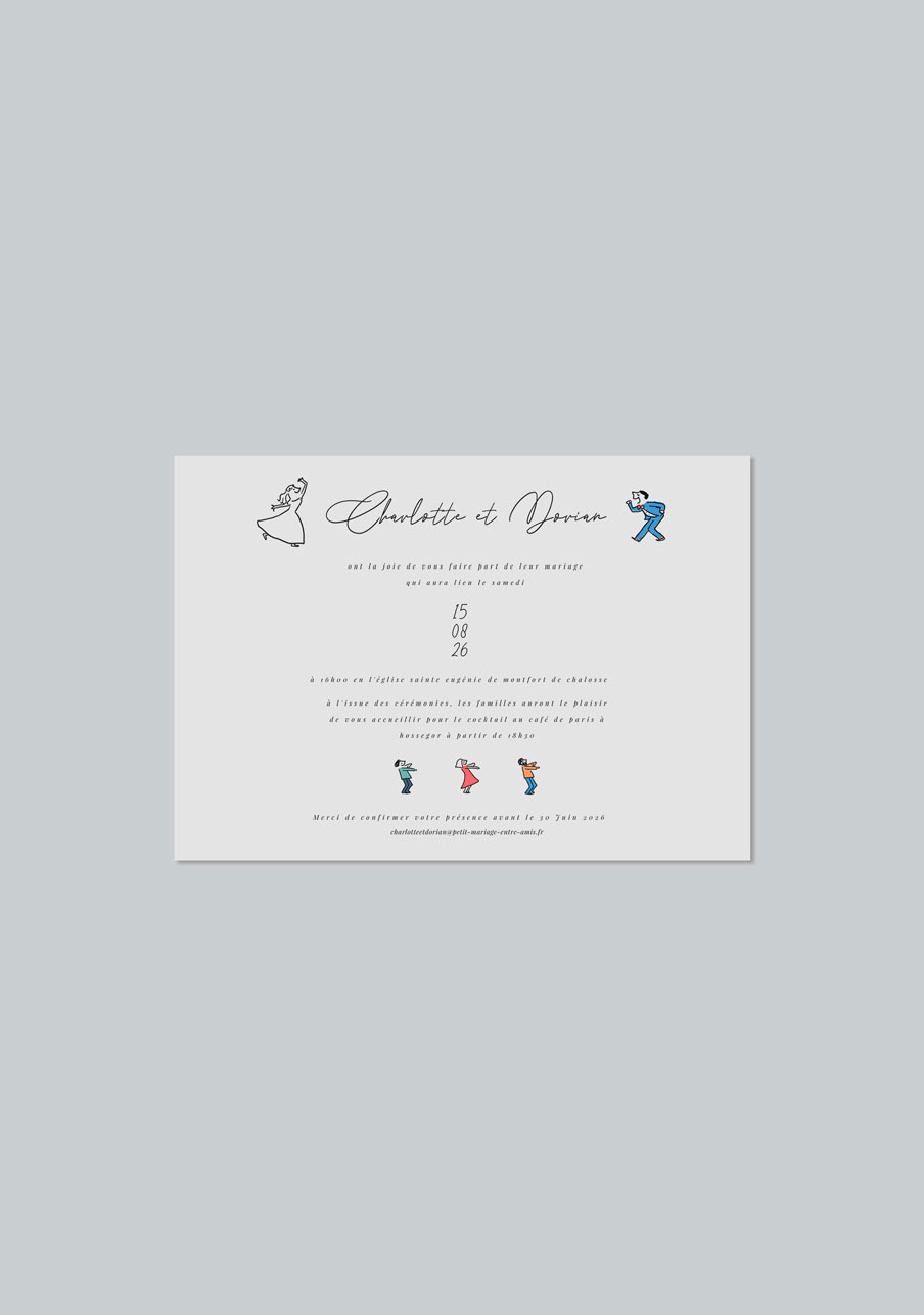 - Carton réponse (en option) : 14.8 x 10.5 cm en papier Olin mat 300gr blanc naturel (lisse) ou Rives Tradition 320gr