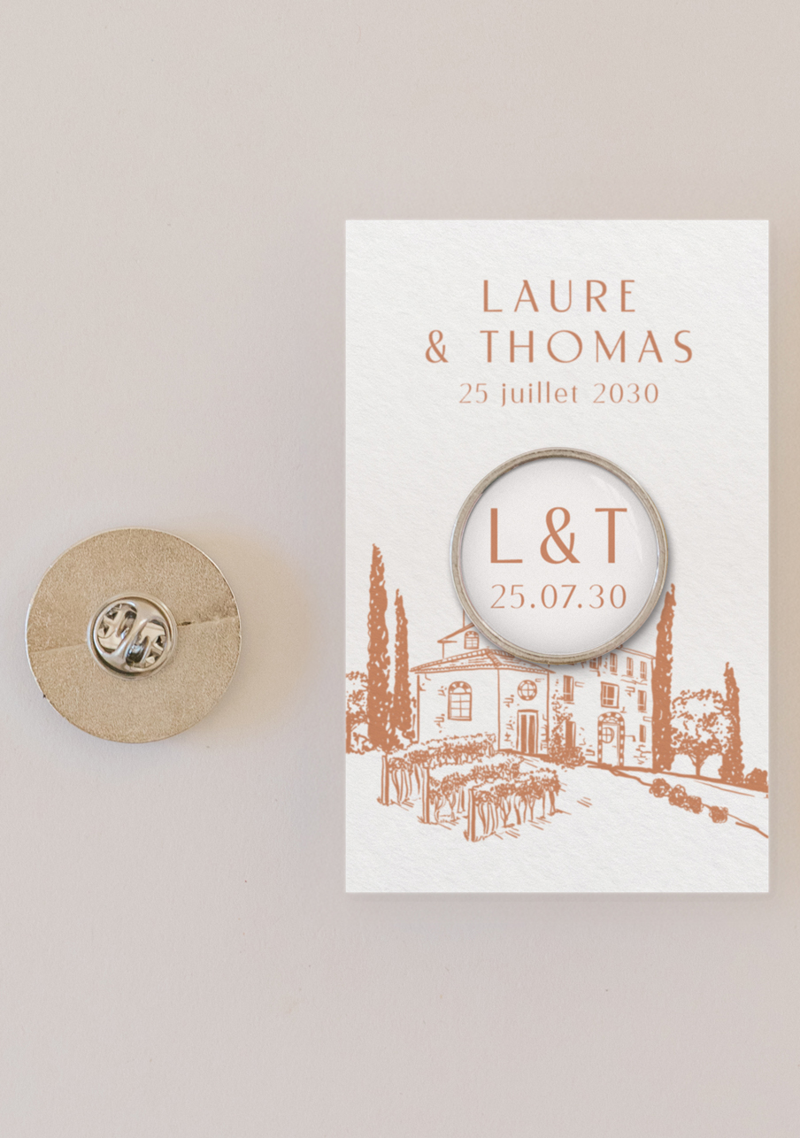 - Offrez à vos invités un pin’s personnalisé de mariage qui fera toute la différence : un petit accessoire tendance, élégant et totalement à votre image. Personnalisable avec vos prénoms, votre date et un visuel unique, ce pin’s devient un souvenir mémorable que chacun pourra conserver et porter. Un cadeau original, durable et irrésistible pour célébrer votre plus beau jour.