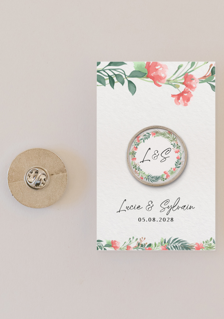 - Offrez à vos invités un pin’s personnalisé de mariage qui fera toute la différence : un petit accessoire tendance, élégant et totalement à votre image. Personnalisable avec vos prénoms, votre date et un visuel unique, ce pin’s devient un souvenir mémorable que chacun pourra conserver et porter. Un cadeau original, durable et irrésistible pour célébrer votre plus beau jour.