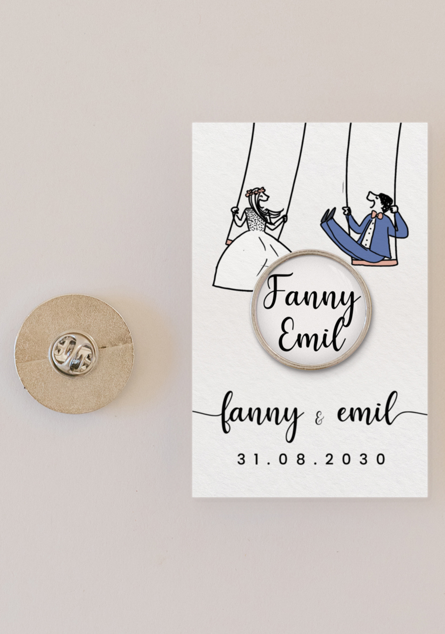 - Offrez à vos invités un pin’s personnalisé de mariage qui fera toute la différence : un petit accessoire tendance, élégant et totalement à votre image. Personnalisable avec vos prénoms, votre date et un visuel unique, ce pin’s devient un souvenir mémorable que chacun pourra conserver et porter. Un cadeau original, durable et irrésistible pour célébrer votre plus beau jour.