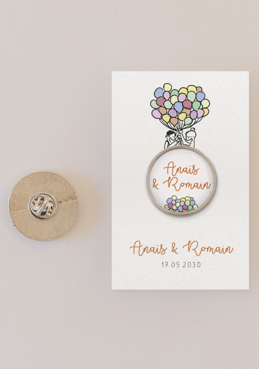 - Offrez à vos invités un pin’s personnalisé de mariage qui fera toute la différence : un petit accessoire tendance, élégant et totalement à votre image. Personnalisable avec vos prénoms, votre date et un visuel unique, ce pin’s devient un souvenir mémorable que chacun pourra conserver et porter. Un cadeau original, durable et irrésistible pour célébrer votre plus beau jour.