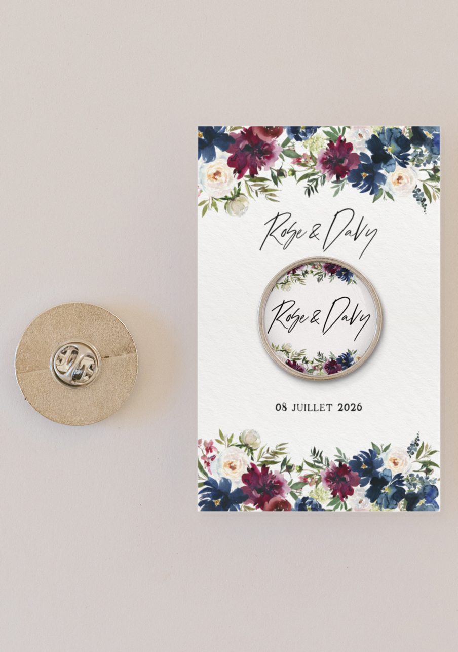 - Offrez à vos invités un pin’s personnalisé de mariage qui fera toute la différence : un petit accessoire tendance, élégant et totalement à votre image. Personnalisable avec vos prénoms, votre date et un visuel unique, ce pin’s devient un souvenir mémorable que chacun pourra conserver et porter. Un cadeau original, durable et irrésistible pour célébrer votre plus beau jour.