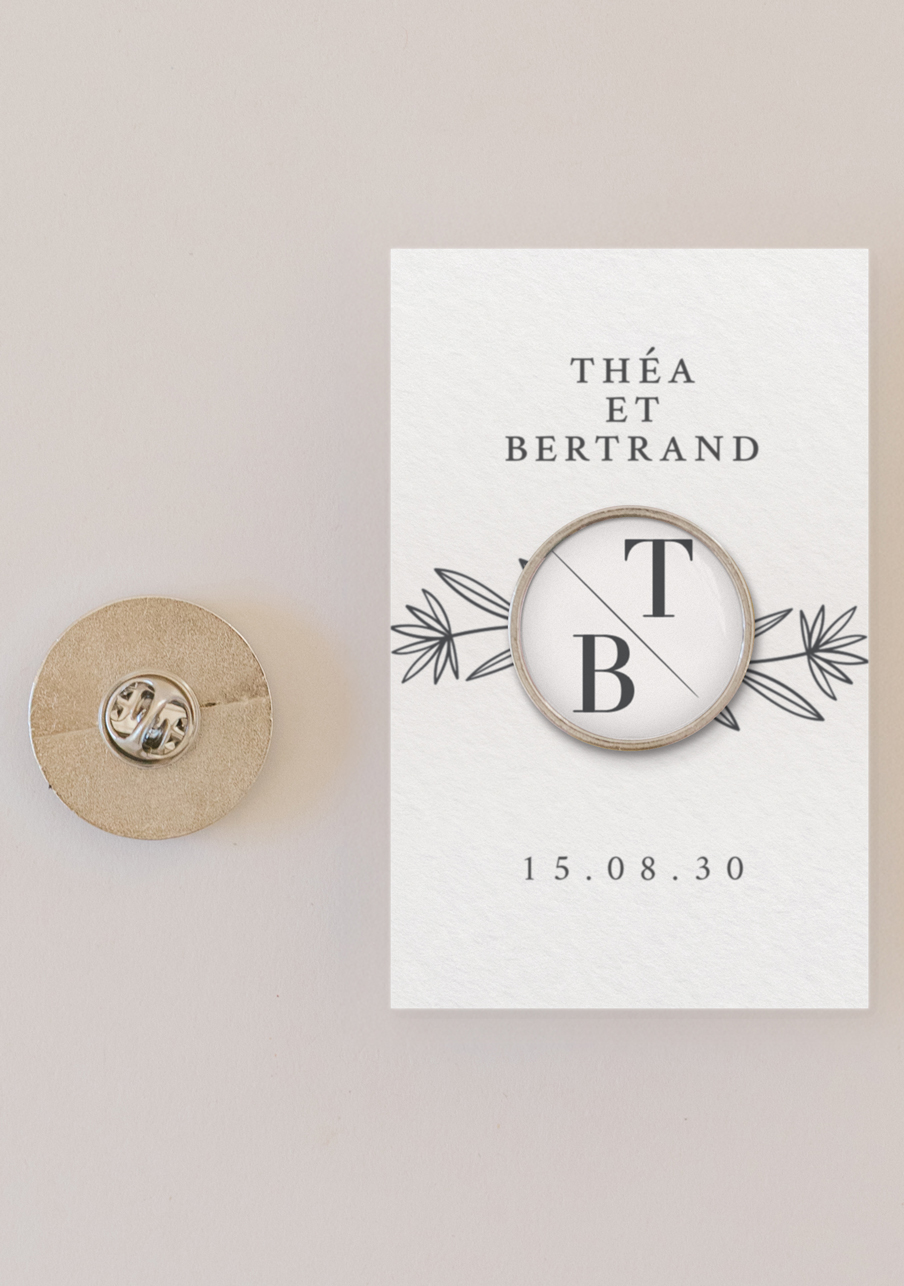 • Offrez à vos invités un pin’s personnalisé de mariage qui fera toute la différence : un petit accessoire tendance, élégant et totalement à votre image. Personnalisable avec vos prénoms, votre date et un visuel unique, ce pin’s devient un souvenir mémorable que chacun pourra conserver et porter. Un cadeau original, durable et irrésistible pour célébrer votre plus beau jour.
