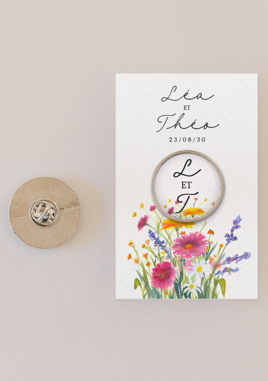 - Offrez à vos invités un pin’s personnalisé de mariage qui fera toute la différence : un petit accessoire tendance, élégant et totalement à votre image. Personnalisable avec vos prénoms, votre date et un visuel unique, ce pin’s devient un souvenir mémorable que chacun pourra conserver et porter. Un cadeau original, durable et irrésistible pour célébrer votre plus beau jour.