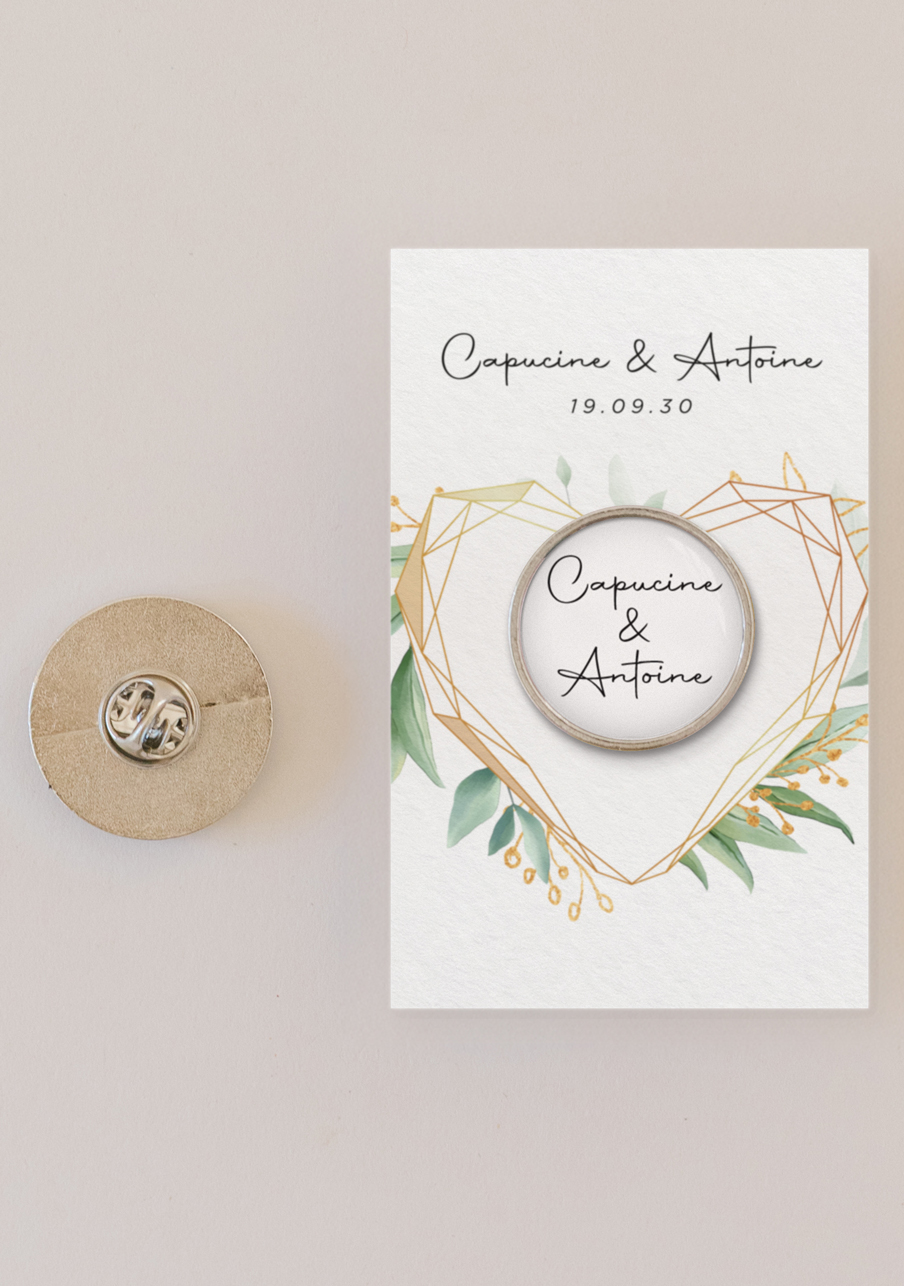 - Offrez à vos invités un pin’s personnalisé de mariage qui fera toute la différence : un petit accessoire tendance, élégant et totalement à votre image. Personnalisable avec vos prénoms, votre date et un visuel unique, ce pin’s devient un souvenir mémorable que chacun pourra conserver et porter. Un cadeau original, durable et irrésistible pour célébrer votre plus beau jour.