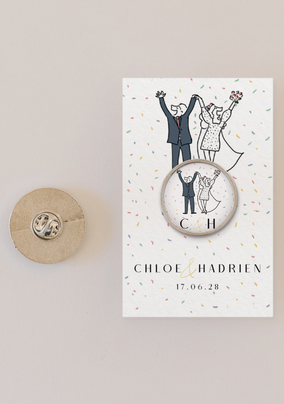 - Offrez à vos invités un pin’s personnalisé de mariage qui fera toute la différence : un petit accessoire tendance, élégant et totalement à votre image. Personnalisable avec vos prénoms, votre date et un visuel unique, ce pin’s devient un souvenir mémorable que chacun pourra conserver et porter. Un cadeau original, durable et irrésistible pour célébrer votre plus beau jour.