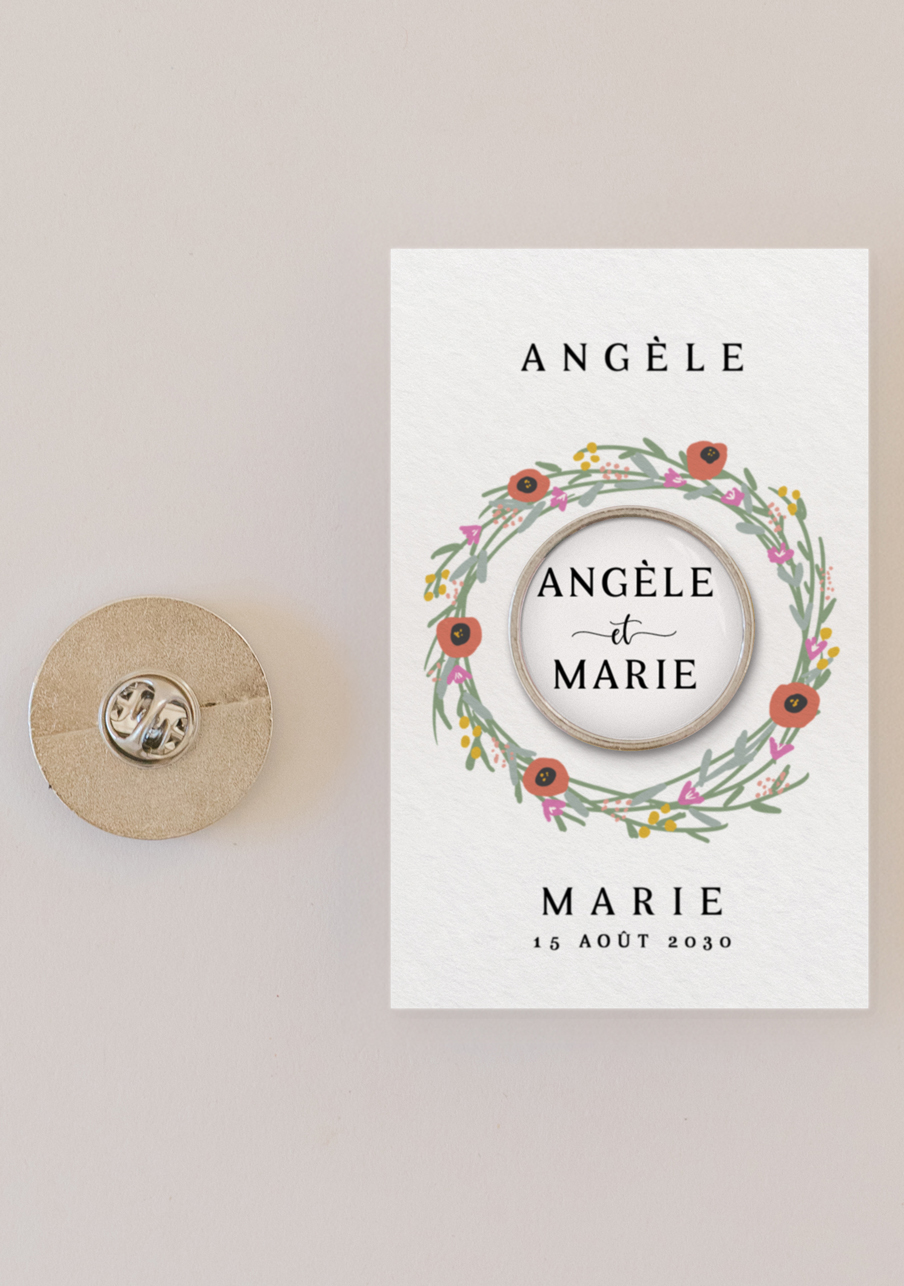- Offrez à vos invités un pin’s personnalisé de mariage qui fera toute la différence : un petit accessoire tendance, élégant et totalement à votre image. Personnalisable avec vos prénoms, votre date et un visuel unique, ce pin’s devient un souvenir mémorable que chacun pourra conserver et porter. Un cadeau original, durable et irrésistible pour célébrer votre plus beau jour.