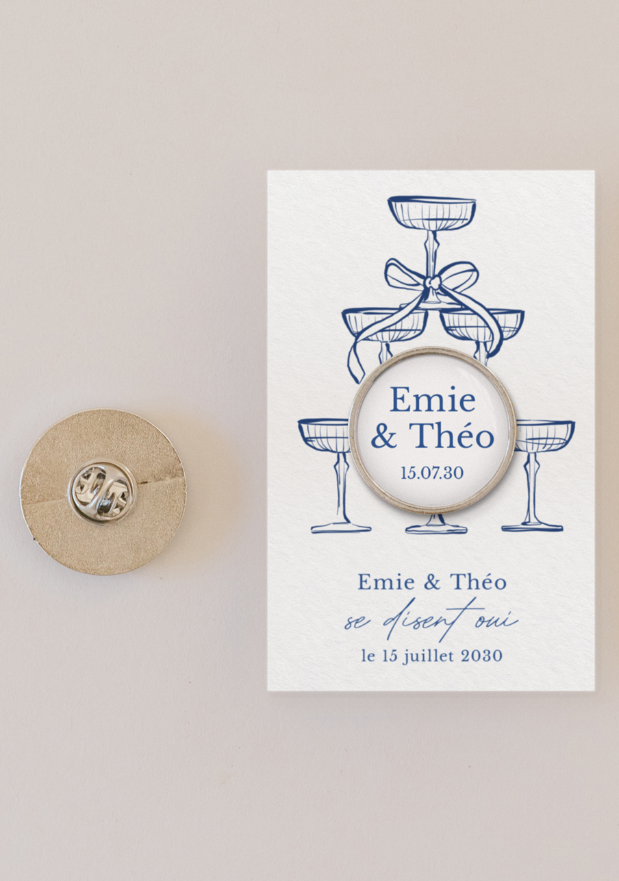 - Offrez à vos invités un pin’s personnalisé de mariage qui fera toute la différence : un petit accessoire tendance, élégant et totalement à votre image. Personnalisable avec vos prénoms, votre date et un visuel unique, ce pin’s devient un souvenir mémorable que chacun pourra conserver et porter. Un cadeau original, durable et irrésistible pour célébrer votre plus beau jour.