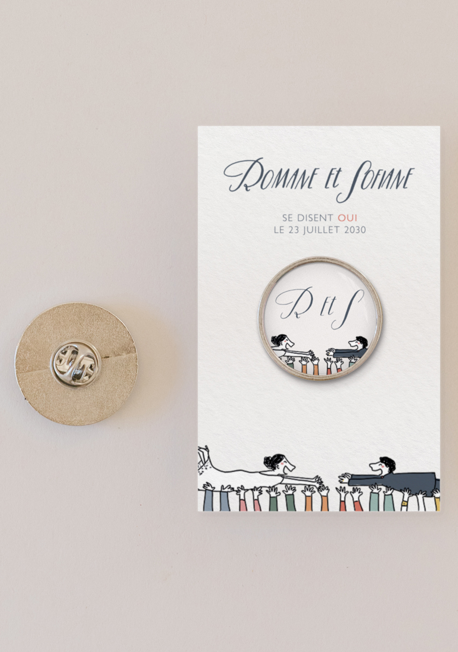 - Offrez à vos invités un pin’s personnalisé de mariage qui fera toute la différence : un petit accessoire tendance, élégant et totalement à votre image. Personnalisable avec vos prénoms, votre date et un visuel unique, ce pin’s devient un souvenir mémorable que chacun pourra conserver et porter. Un cadeau original, durable et irrésistible pour célébrer votre plus beau jour.