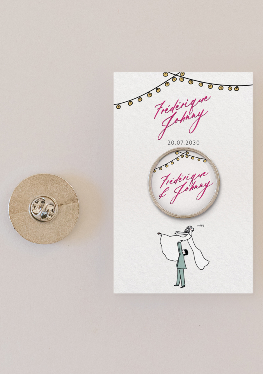 - Offrez à vos invités un pin’s personnalisé de mariage qui fera toute la différence : un petit accessoire tendance, élégant et totalement à votre image. Personnalisable avec vos prénoms, votre date et un visuel unique, ce pin’s devient un souvenir mémorable que chacun pourra conserver et porter. Un cadeau original, durable et irrésistible pour célébrer votre plus beau jour.