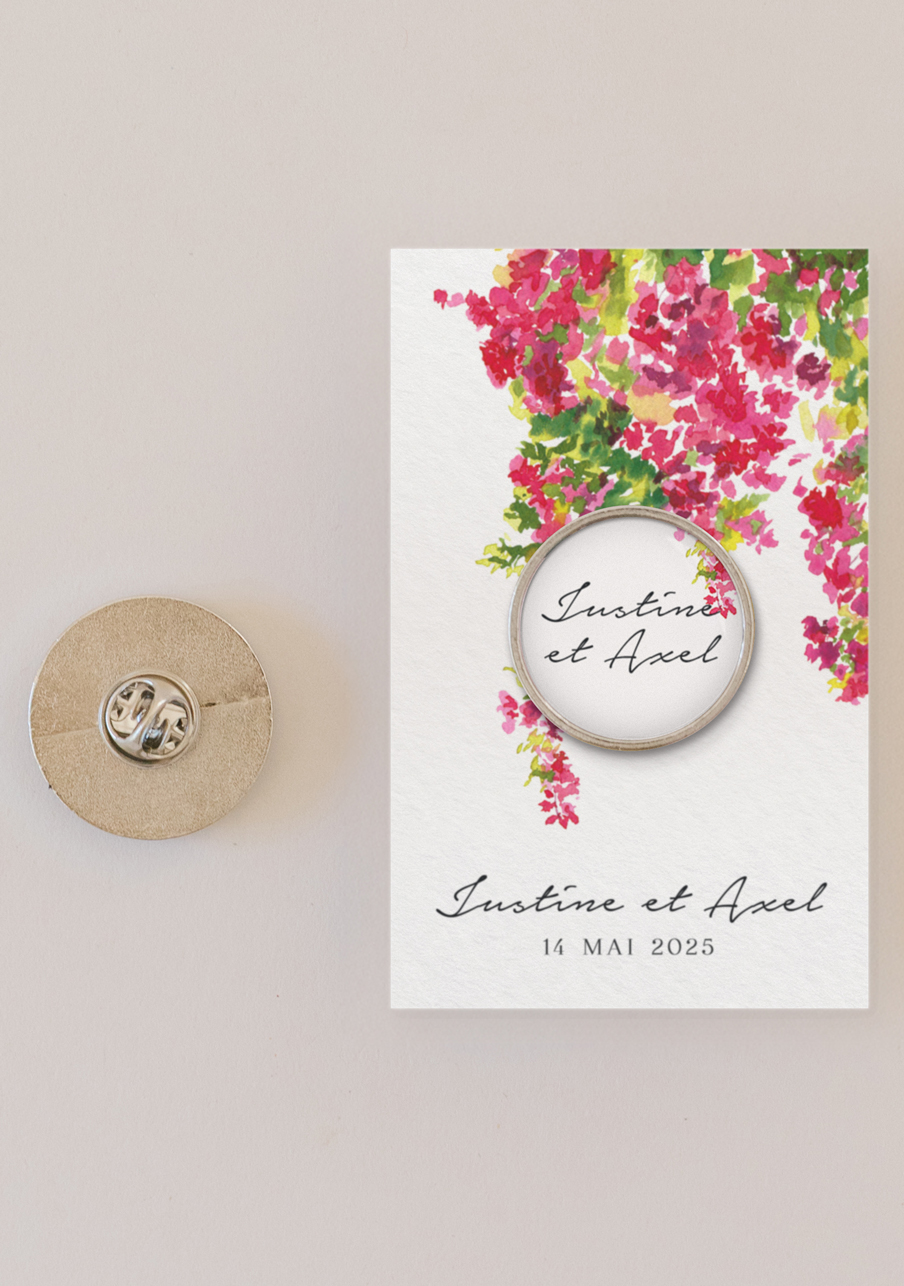 - Offrez à vos invités un pin’s personnalisé de mariage qui fera toute la différence : un petit accessoire tendance, élégant et totalement à votre image. Personnalisable avec vos prénoms, votre date et un visuel unique, ce pin’s devient un souvenir mémorable que chacun pourra conserver et porter. Un cadeau original, durable et irrésistible pour célébrer votre plus beau jour.