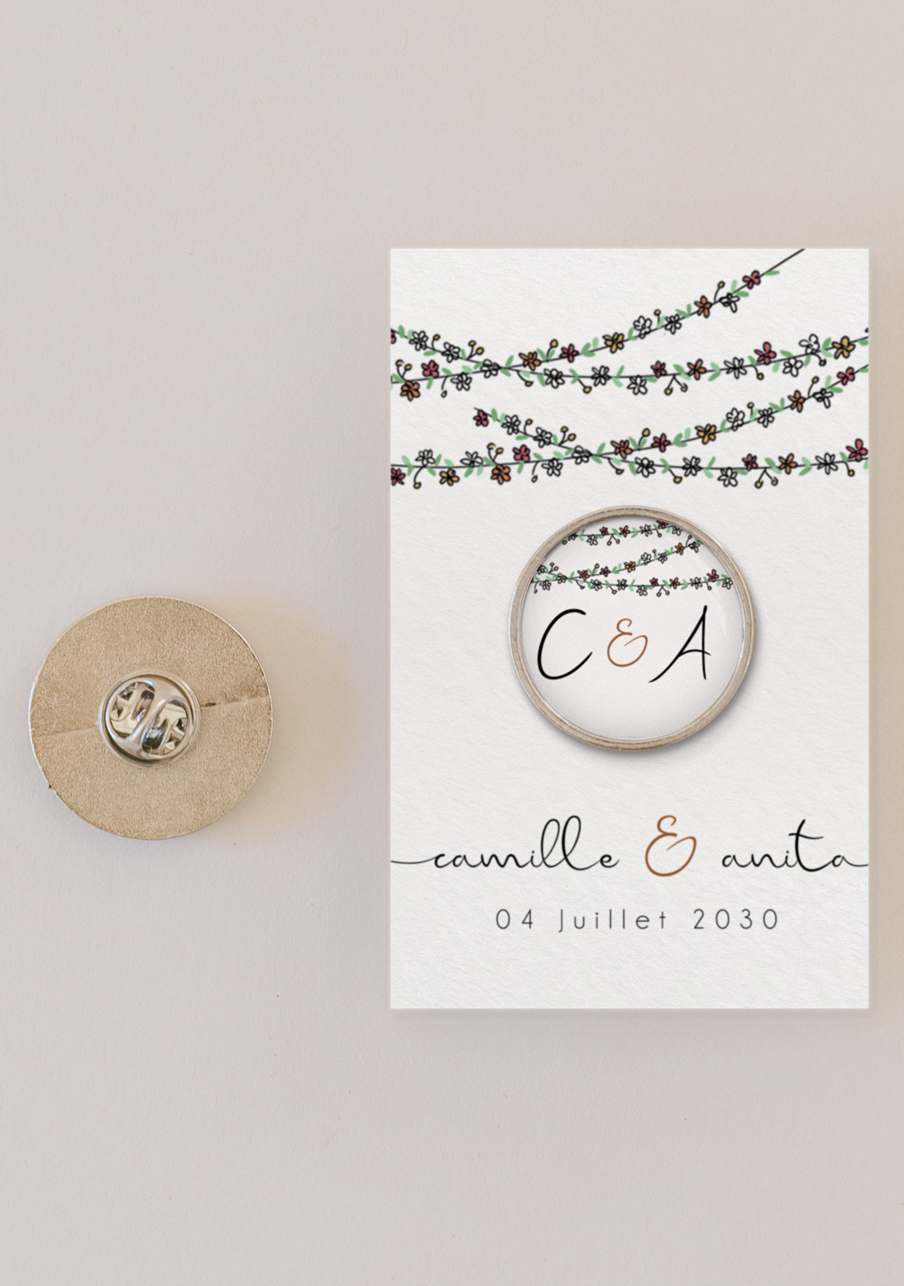 - Offrez à vos invités un pin’s personnalisé de mariage qui fera toute la différence : un petit accessoire tendance, élégant et totalement à votre image. Personnalisable avec vos prénoms, votre date et un visuel unique, ce pin’s devient un souvenir mémorable que chacun pourra conserver et porter. Un cadeau original, durable et irrésistible pour célébrer votre plus beau jour.