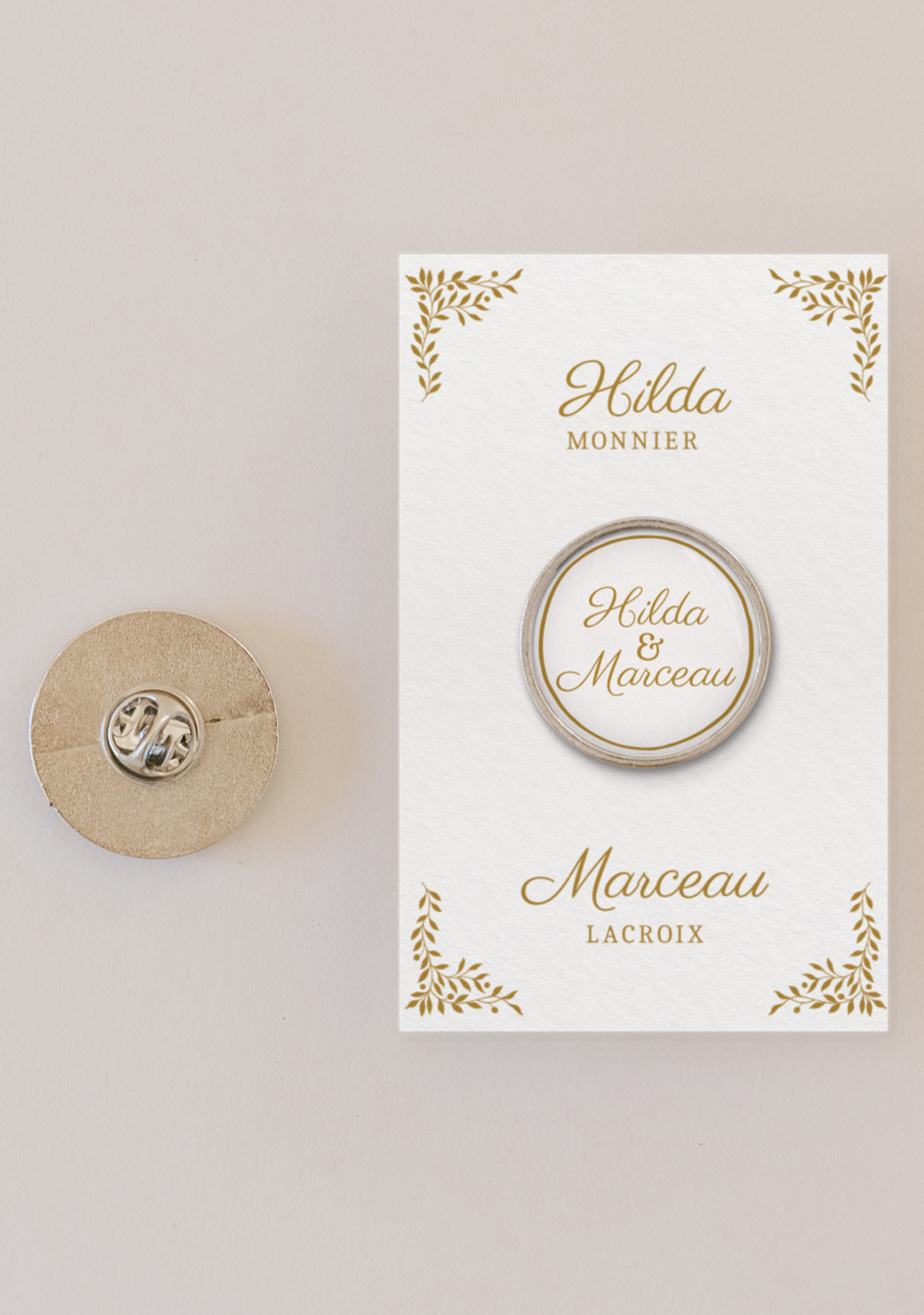 - Offrez à vos invités un pin’s personnalisé de mariage qui fera toute la différence : un petit accessoire tendance, élégant et totalement à votre image. Personnalisable avec vos prénoms, votre date et un visuel unique, ce pin’s devient un souvenir mémorable que chacun pourra conserver et porter. Un cadeau original, durable et irrésistible pour célébrer votre plus beau jour.